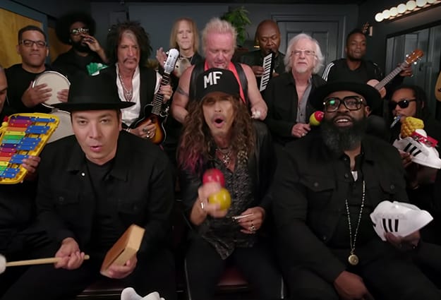 Jimmy Fallon was joined by Aerosmith and The Roots on The Tonight Show Starring Jimmy Fallon to perform ‘Walk This Way‘ with classroom instruments. Watch