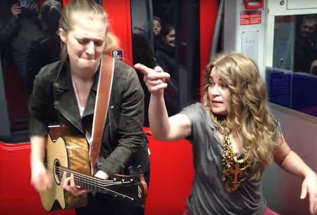 Two female performers, Heidi Joubert and Kiddo Kat, caught commuters off guard with an unexpected train jam. The performance sees the two musicians combining their skills